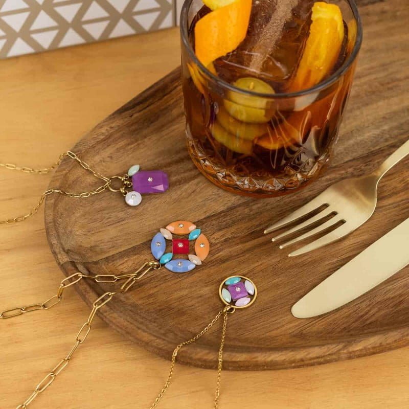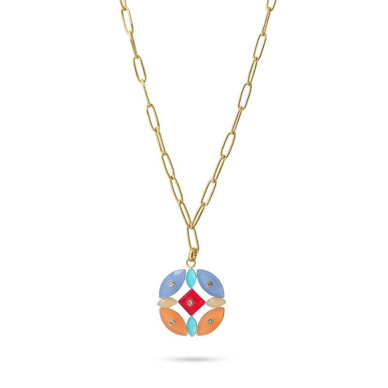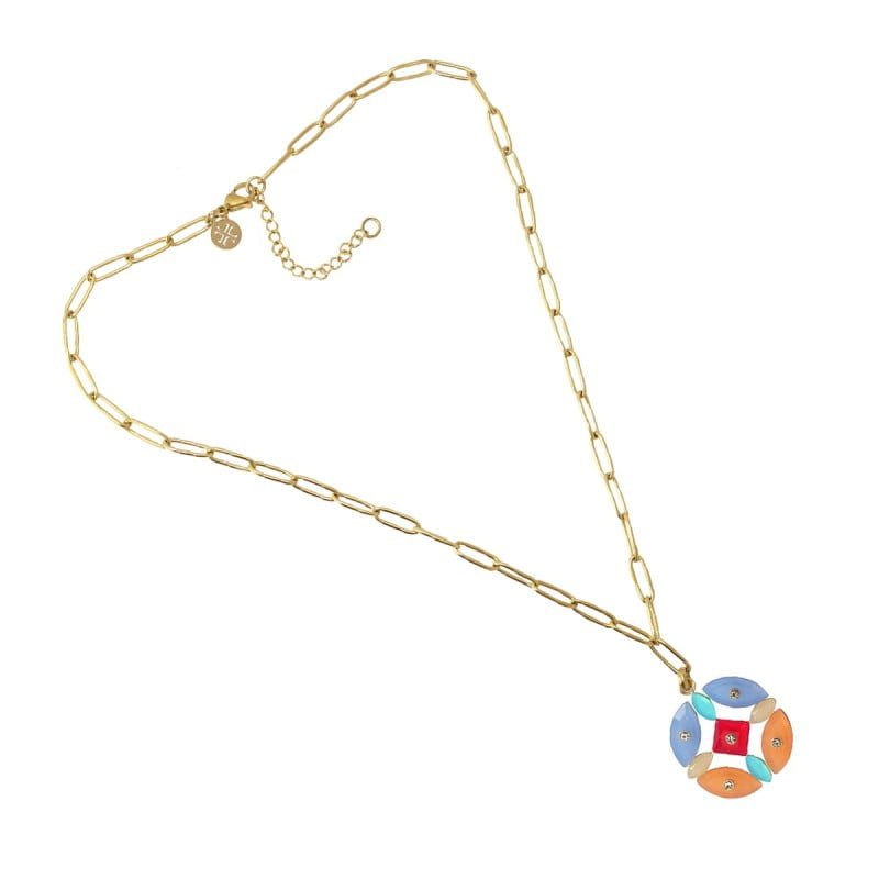 Collar de mini eslabones con colgante tipo flor formado por piezas realizadas en material acrílico coloreado y circonitas. Color y volumen ideales para llevar a diario sobre camisas o escotes de cuello vuelto. Dale un toque de color a tus outfits y combínalo con sus pendientes a juego. No produce alergia y se puede mojar.